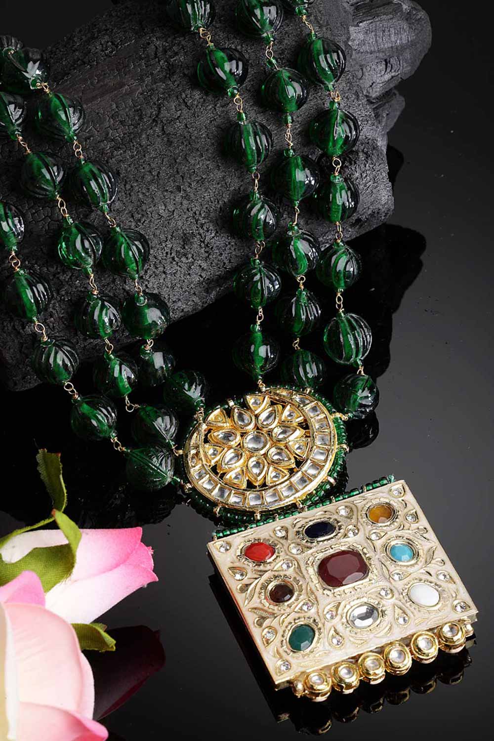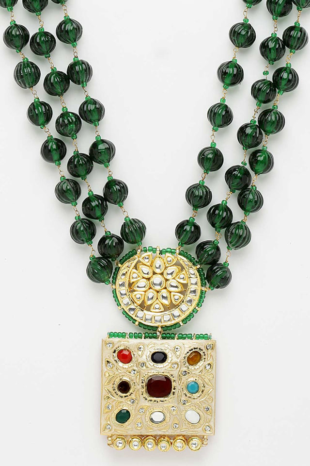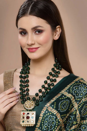 Green And Maroon Gold-Plated Kundan And Pearl Bead Necklaces