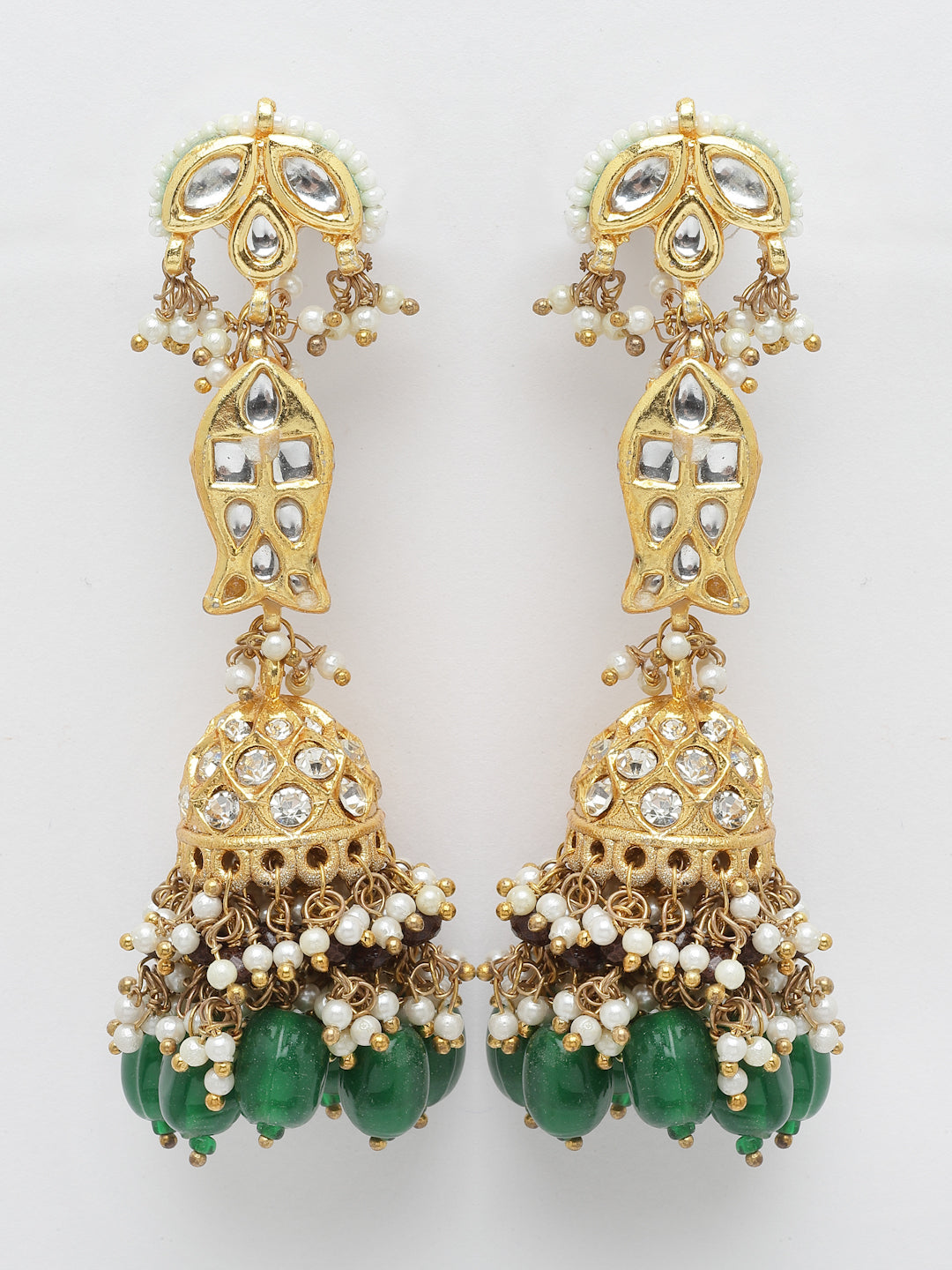 Green And White Gold-Plated Kundan And American Diamonds Jhumkas Earring