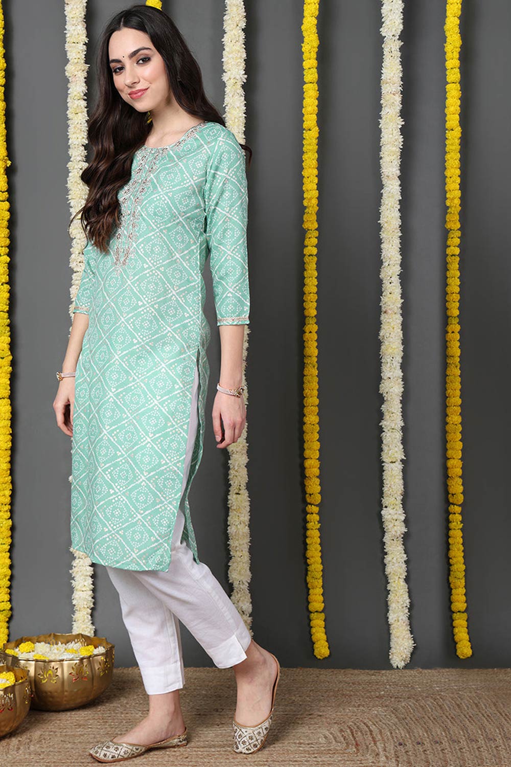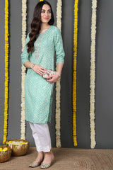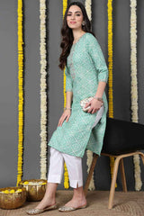 This Green Cotton Blend Bandhani Round Neck Kurti is a timeless choice for any occasion. The intricate prints add a touch of sophistication to the ensemble, while the comfortable rayon fabric ensures effortless elegance and ease throughout the day.