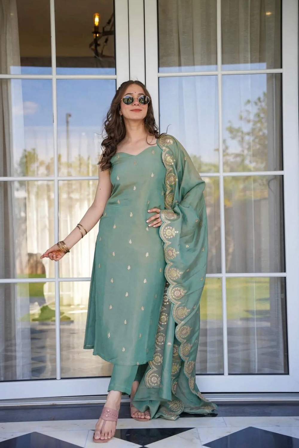 Step into effortless style with our Straight Cut Suit Set crafted for the modern woman who cherishes tradition. Made from soft Viscose Chanderi it keeps you comfortable all day long. TheEmbroidered design lends a touch of sophistication to your outfit. Perfect for Festive this Straight Cut Suit Set is a must-have for versatile styling options. Style it with minimalistic accessories and flats for a casual look or jewelry and heels for special events