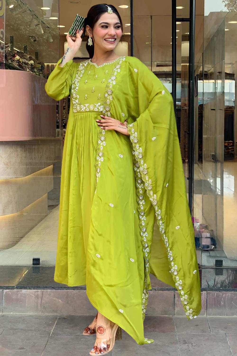 Stay stylish and comfortable with our Palazzo Suit Set designed for all-day elegance. Made with Chinon this set is perfect for easy movement and timeless appeal. The beautiful and intricate Embroidered elevate its design for Festivewear or daily wear, this kurti set is your go-to outfit. Pair it with elegant earrings and kolhapuri sandals or a heels for a traditional look or wedges for a modern edge