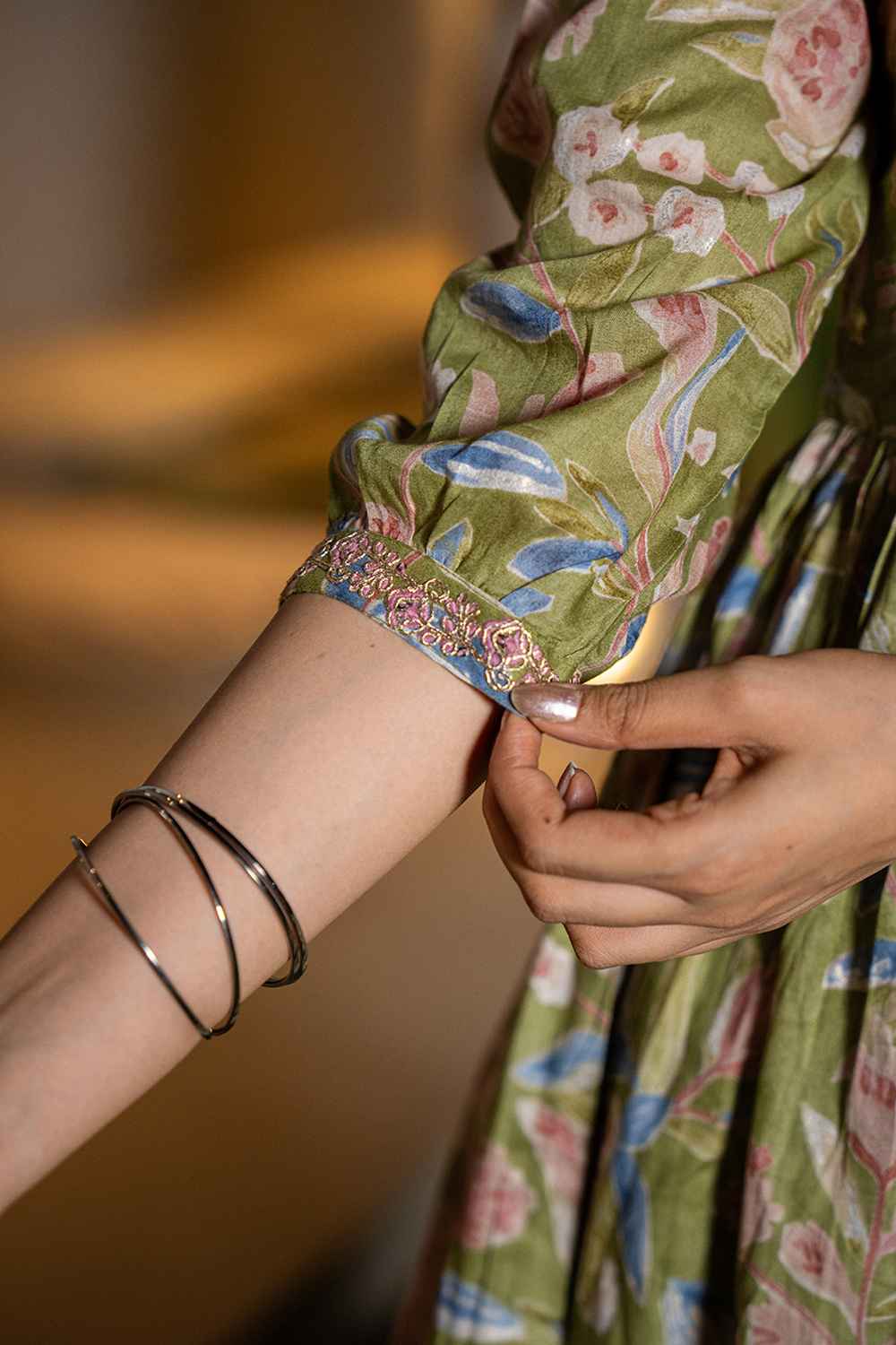 Green Floral Print Sequins Work Pure Cotton Kurti Pant Set