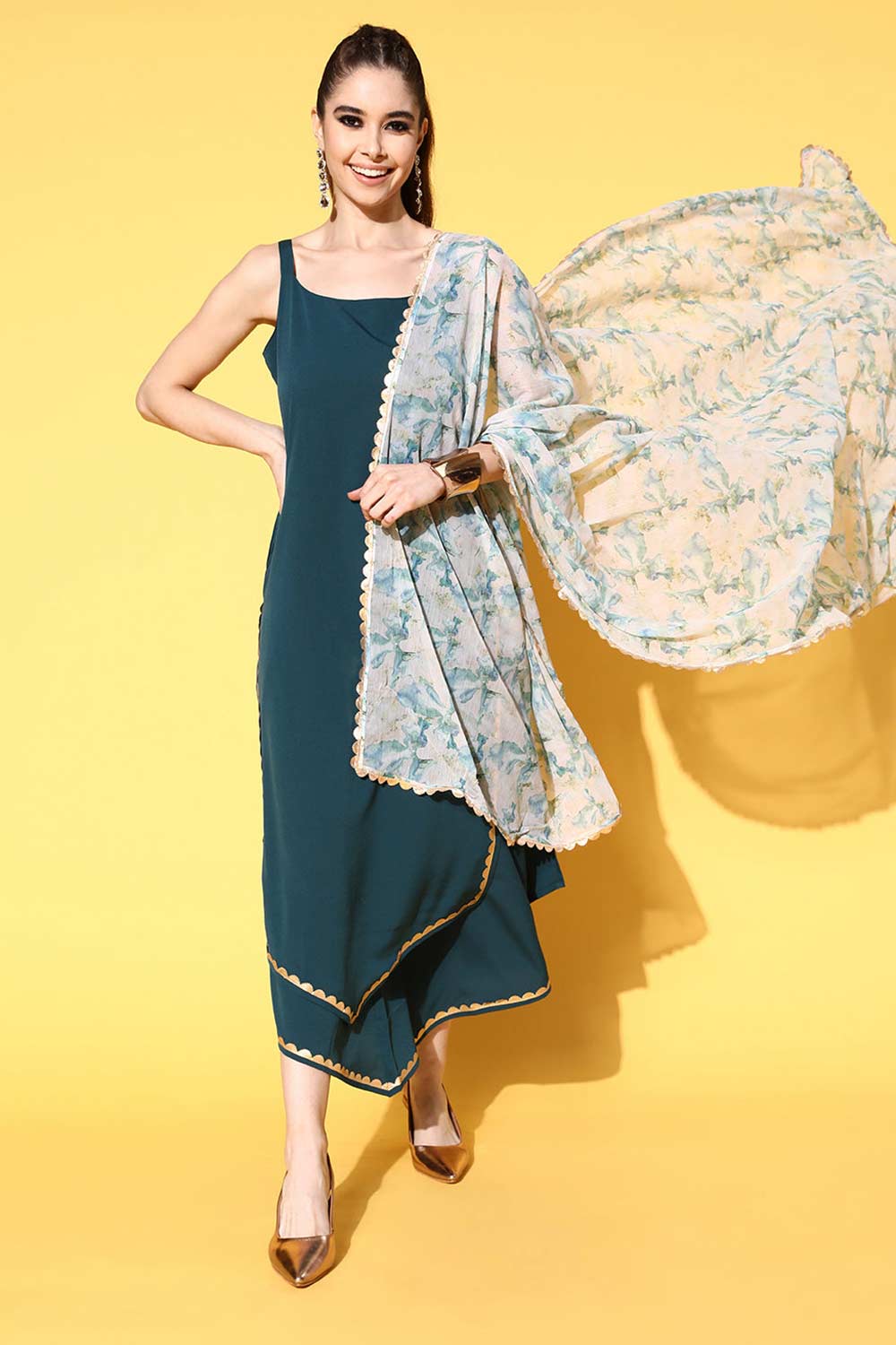 Green Poly Crepe Solid Kurta Palazzo Set With Dupatta