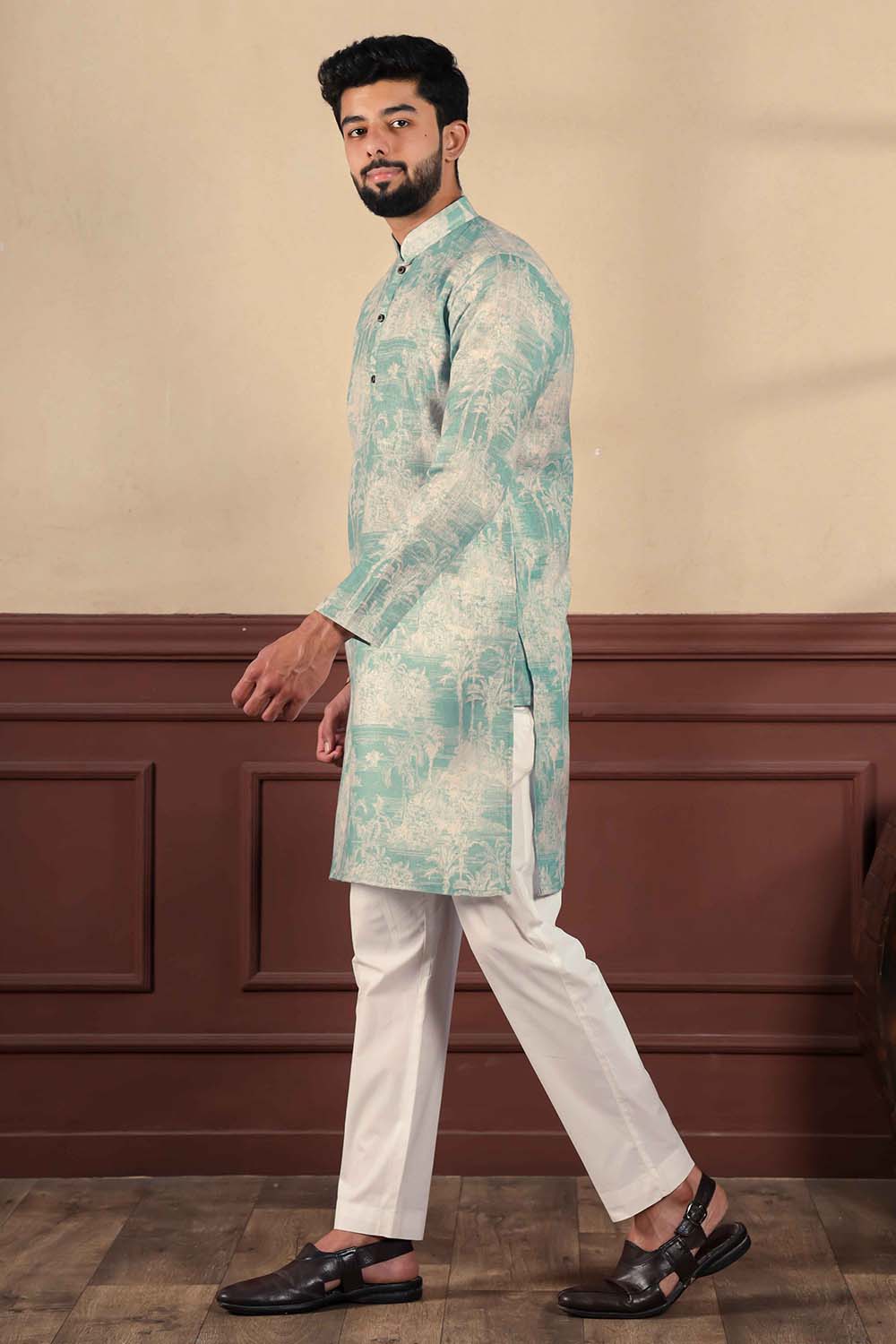 Dress him in elegance with our Men's Kurta Sets a classic Kurta Set designed for timeless style. Crafted from soft Linen it offers a comfortable fit for all-day wear. The intricate Printed adds a traditional touch to this outfit. Perfect for Festivewear, this Kurta Set is a versatile choice for any festive or formal occasion. Pair it with white churidar pants and traditional juttis for a complete ethnic outfit. Make every moment special with the charm of Kurta Set
