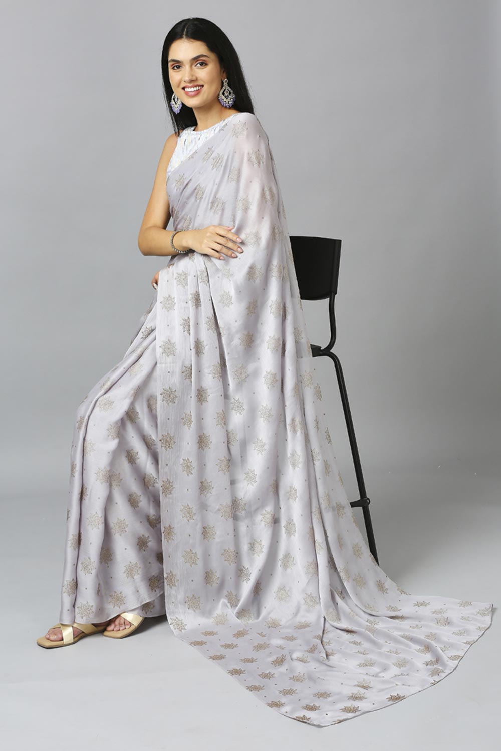 Grey Chiffon Resham Embroidery Party Wear Designer Saree