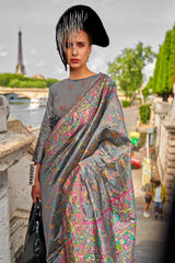 Silk Grey Woven Handloom Saree is a sophisticated and versatile garment that combines the luxurious feel of silk with a refined grey hue.
