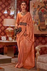 Silk Peach Woven Handloom Saree is a beautiful and elegant garment that combines the luxurious texture of silk with a soft, inviting peach hue.