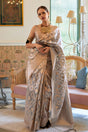 The Kalki Beige Tissue Woven Saree combines the lightweight, ethereal quality of tissue fabric with a sophisticated beige hue and intricate woven details, making it a stylish and graceful choice for any special occasion.