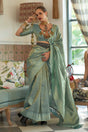 The Kalki Grey Satin Woven Saree combines the luxurious texture of satin with a sophisticated grey hue and intricate woven details, making it a versatile and stylish choice for any special occasion.