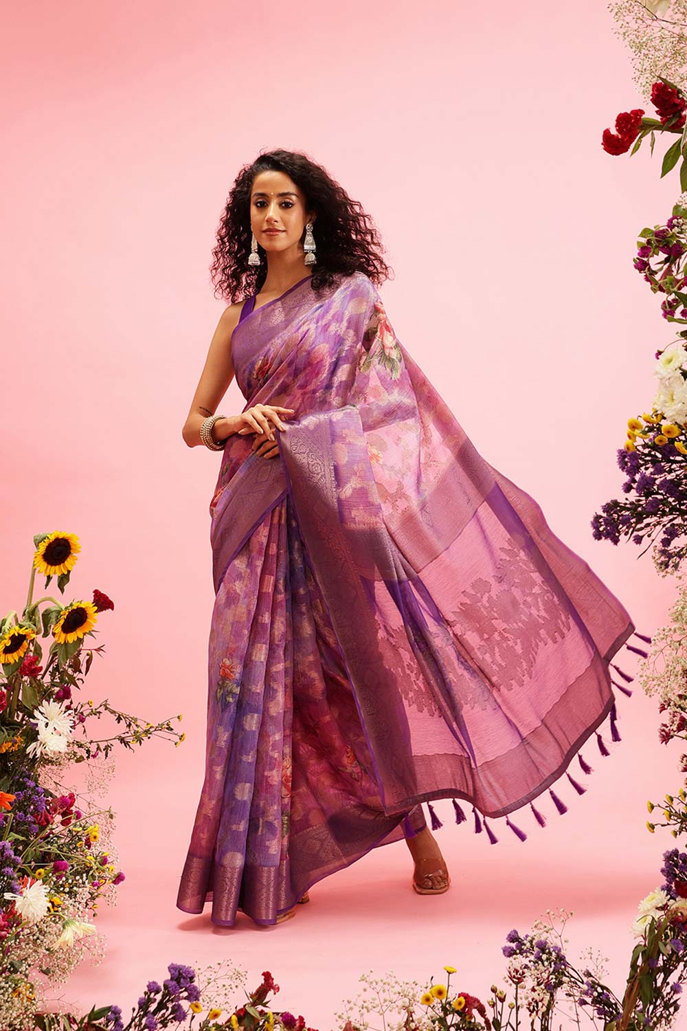 Adorn yourself with this Lavender Cotton Digital Print Banarasi Saree , showcasing intricate woven motifs that offer a touch of classic beauty and modern sophistication.