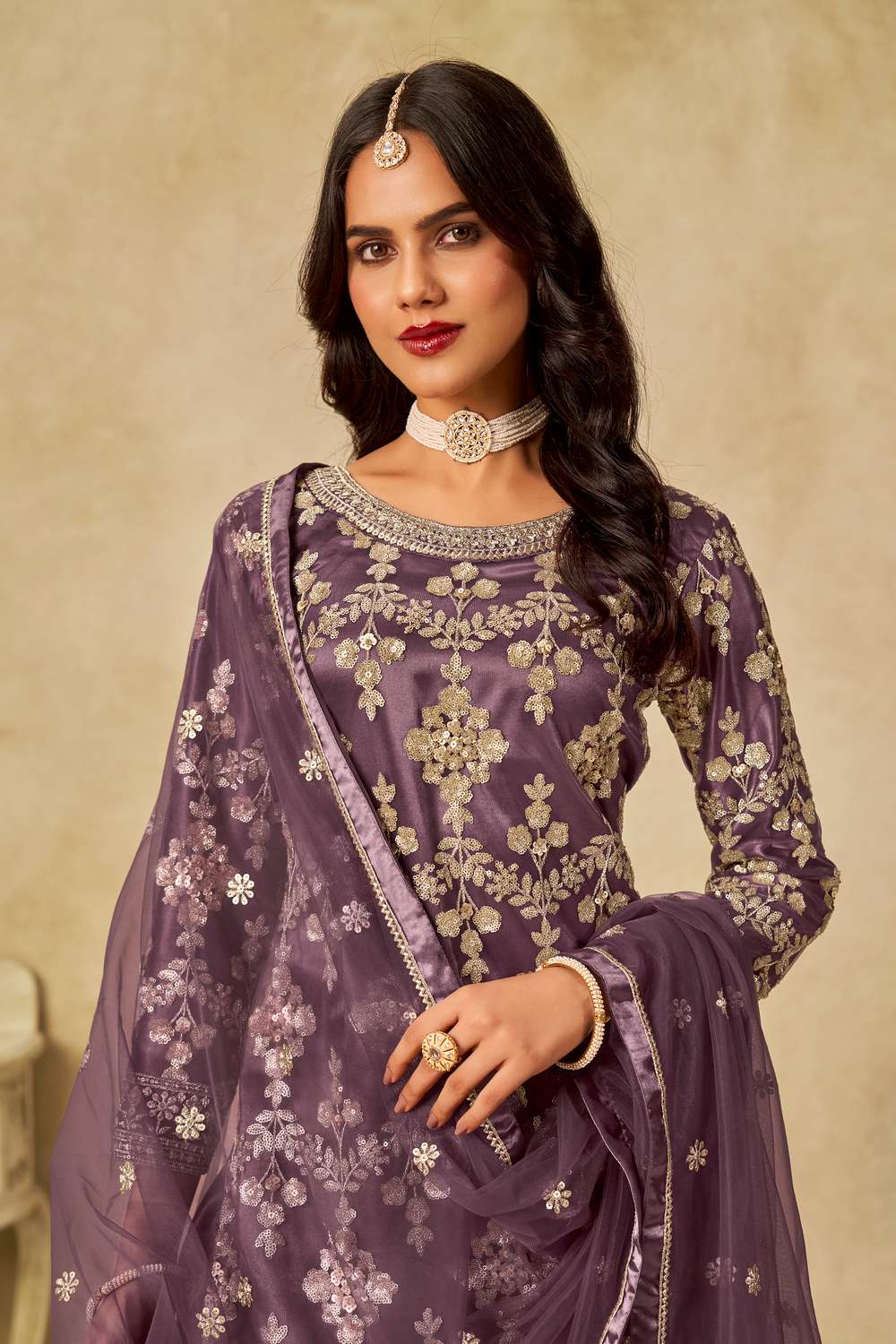 Lavender Floral Sequin Net Palazzo Suit Set
