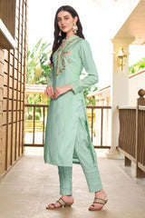 Light Green Hand Embroidery Art Silk Straight Cut Pants Kurti Set