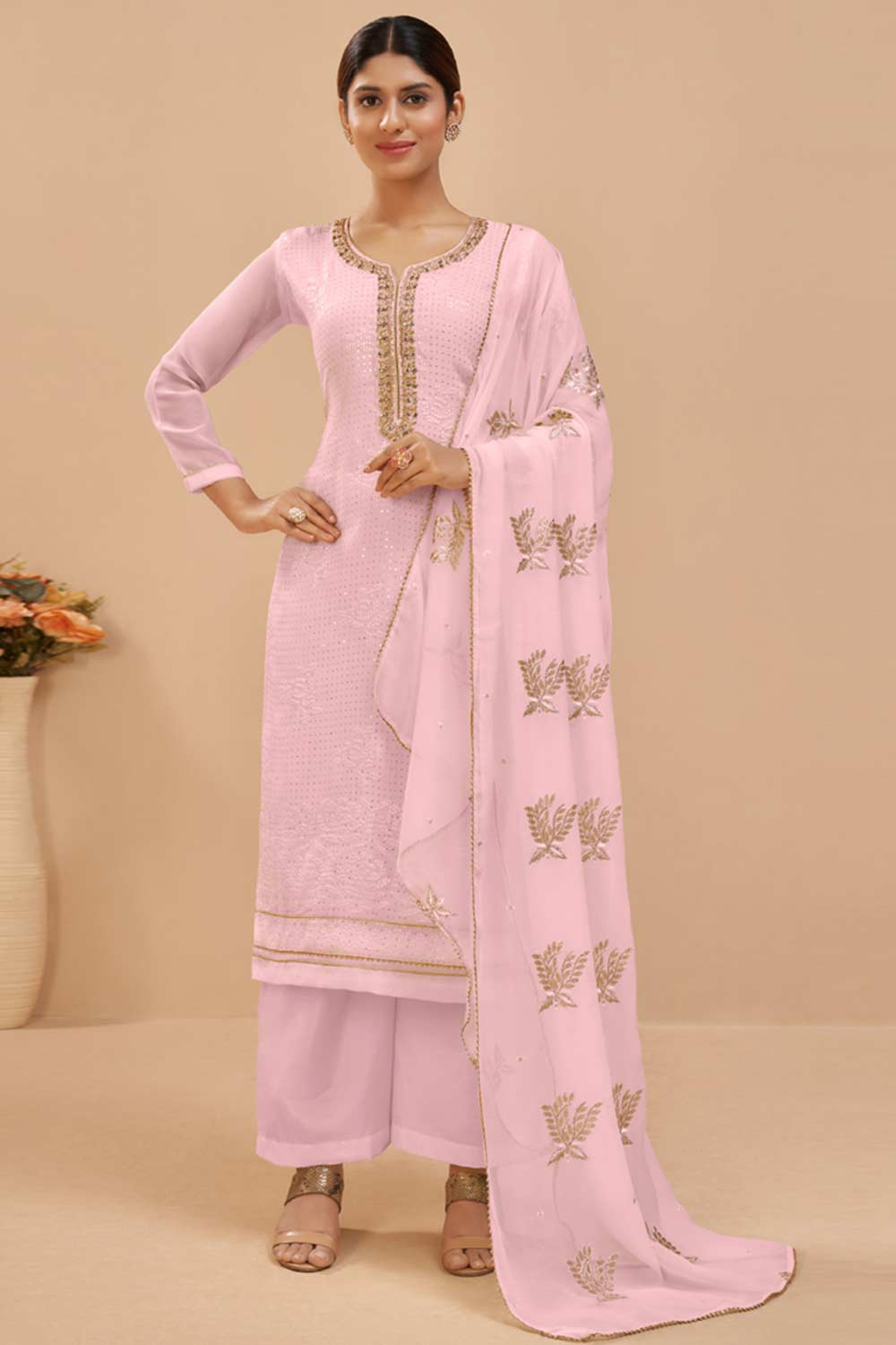 Light Pink Georgette Embroidered Straight Kurta Suits Set