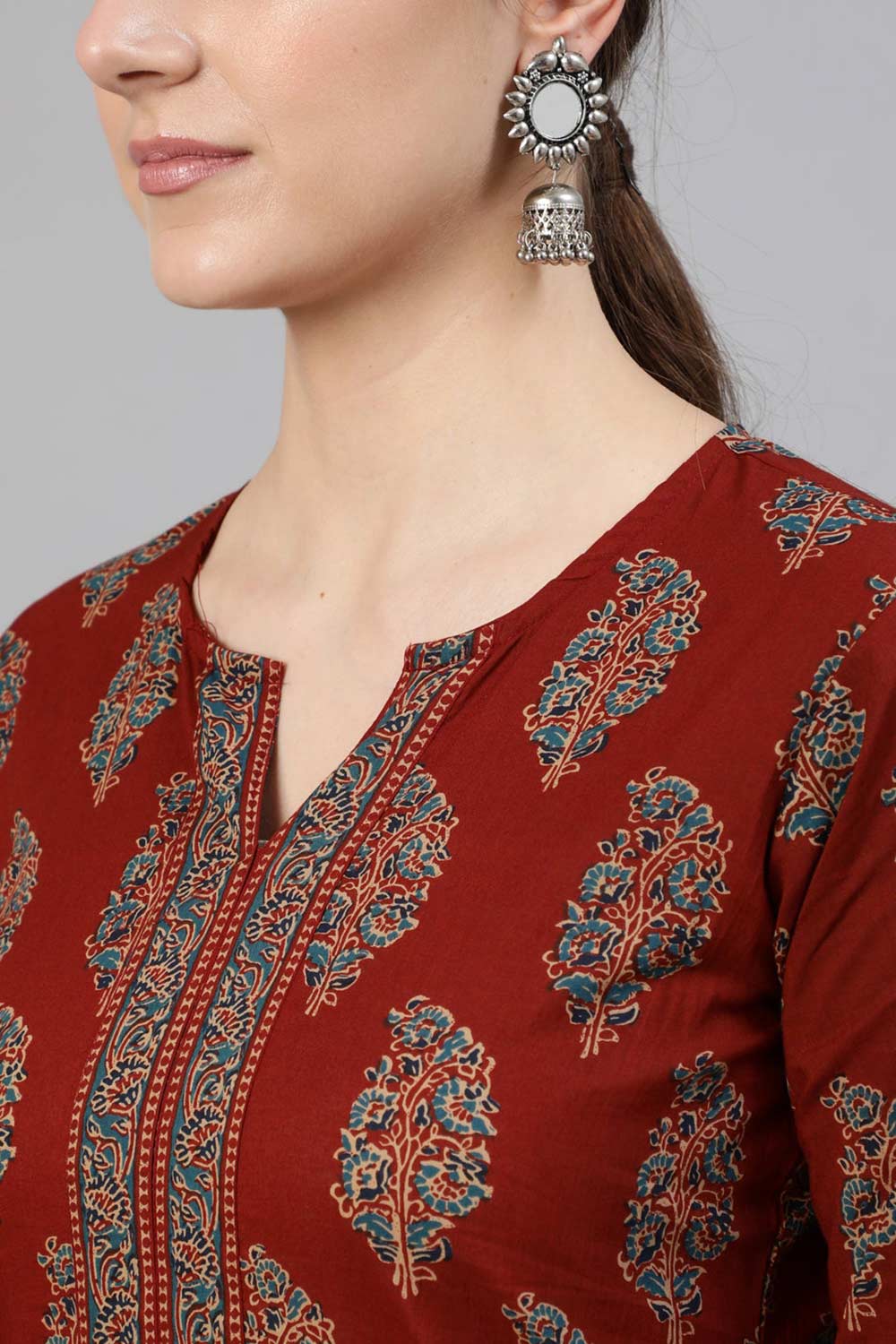 Maroon Cotton Geometric Printed Straight Kurti