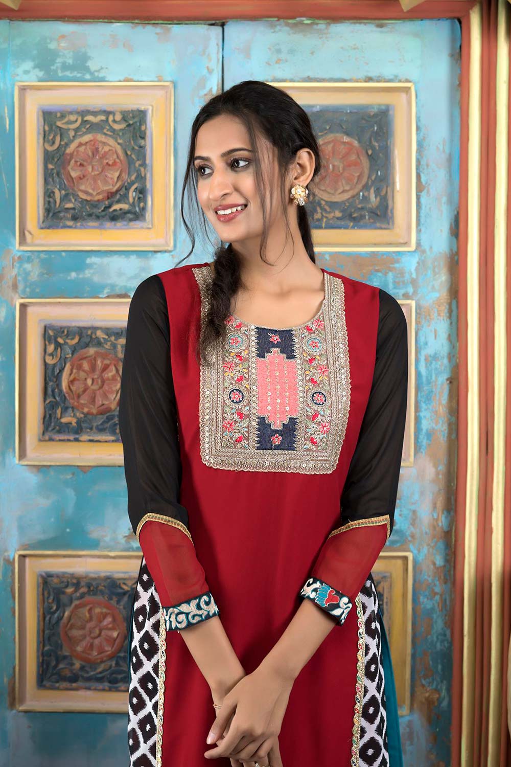 Maroon Embroidered Georgette Straight Cut Suit Set
