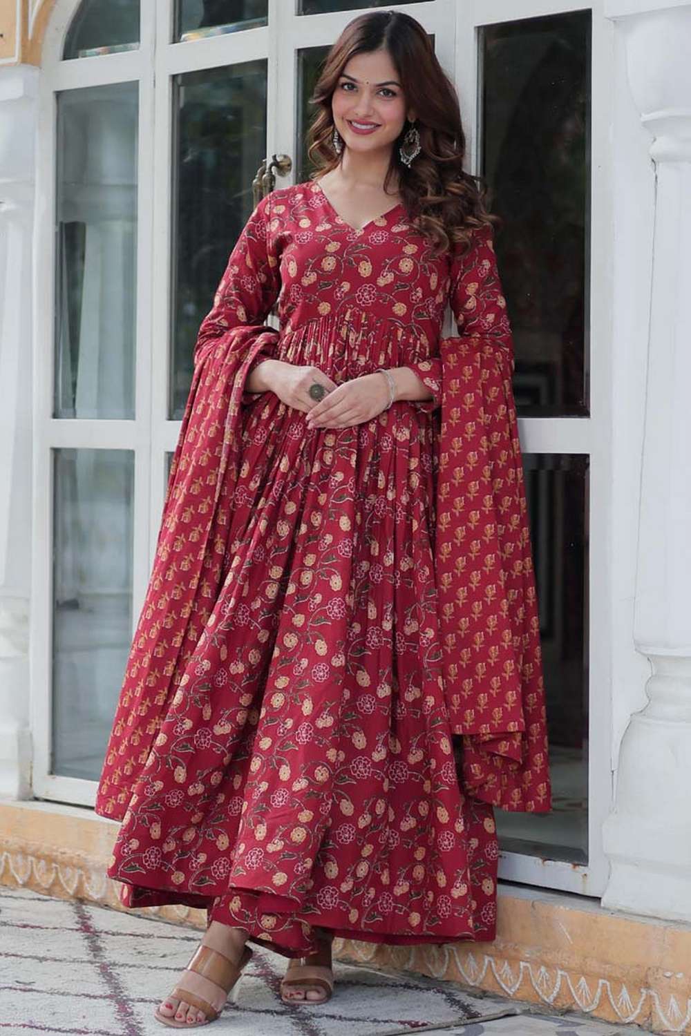 Maroon Floral Printed Cotton Anarkali