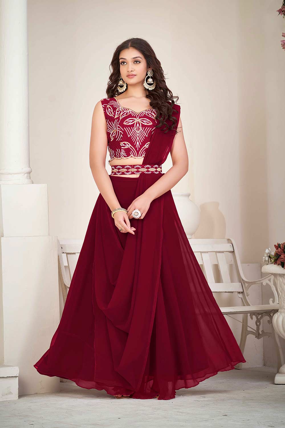 Maroon Greorgtte Embrodiery V-Neck Lehenga