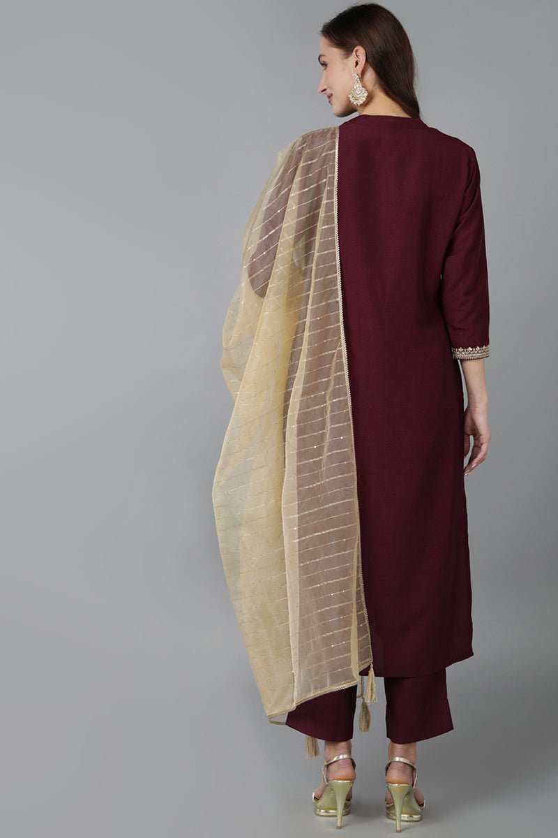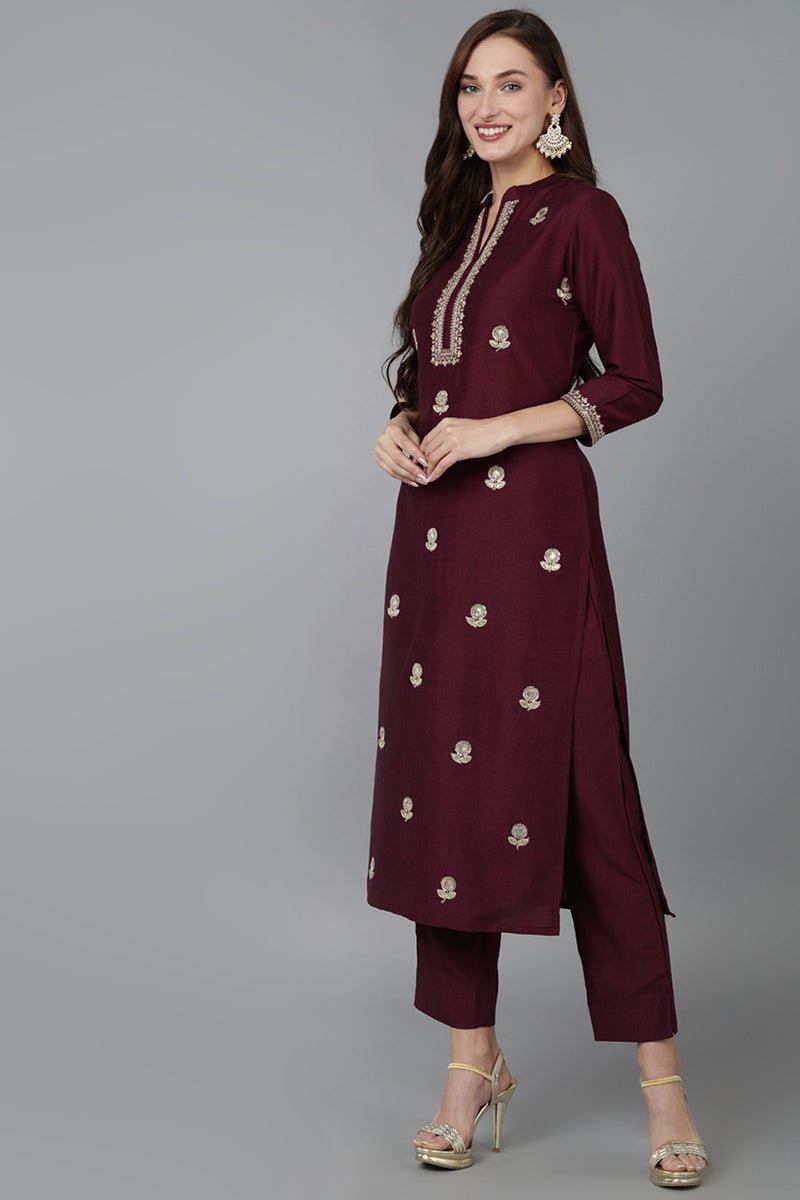 Maroon Silk Blend Solid Straight Kurti Pant Set