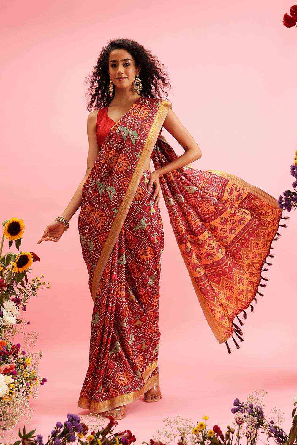 Step into the spotlight with this Maroon Soft Silk Digital Print Pochampally Saree , showcasing intricate woven designs that exude elegance and refined craftsmanship.