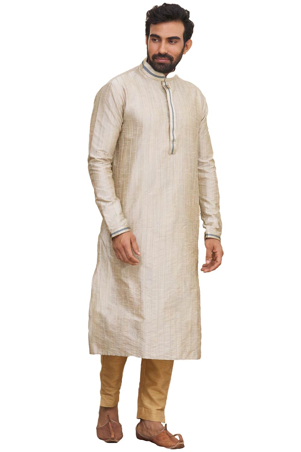 Men's Beige Silk Embroidered Full Sleeve Kurta Pajama