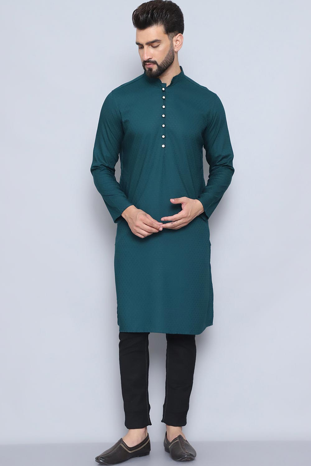 This elegant green cotton solid long kurta is a stylish choice for any wardrobe. The rich green color and classic design provide a fresh and versatile option for various occasions, blending sophistication with comfort.