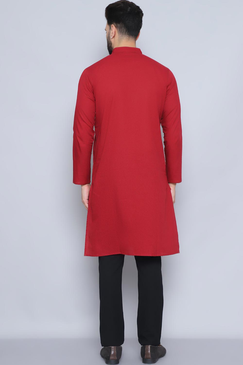 This sophisticated maroon cotton solid long kurta exudes elegance and depth with its rich, warm color. Ideal for both casual and semi-formal occasions, it combines comfort with a touch of refinement.