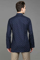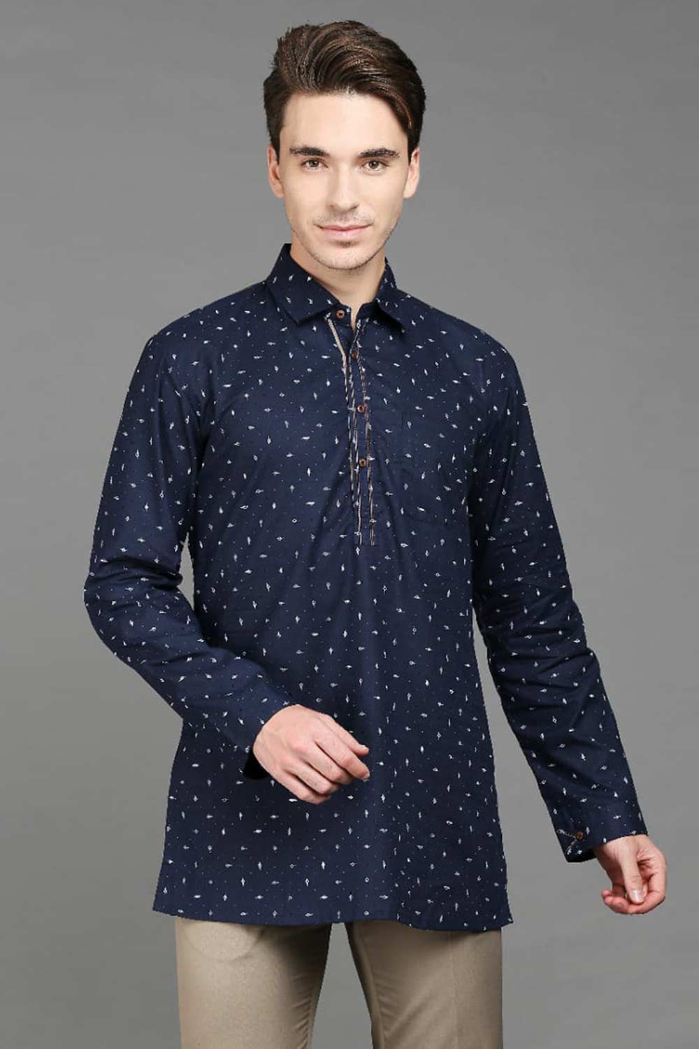 Men's Navy Blue Cotton Solid Full Sleeves Short Kurta