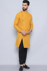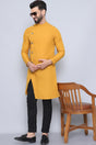 This elegant long kurta in a vibrant yellow hue is crafted from premium cotton, offering both style and comfort. The kurta features a classic silhouette that falls gracefully to the knees or below, making it a versatile piece for various occasions.