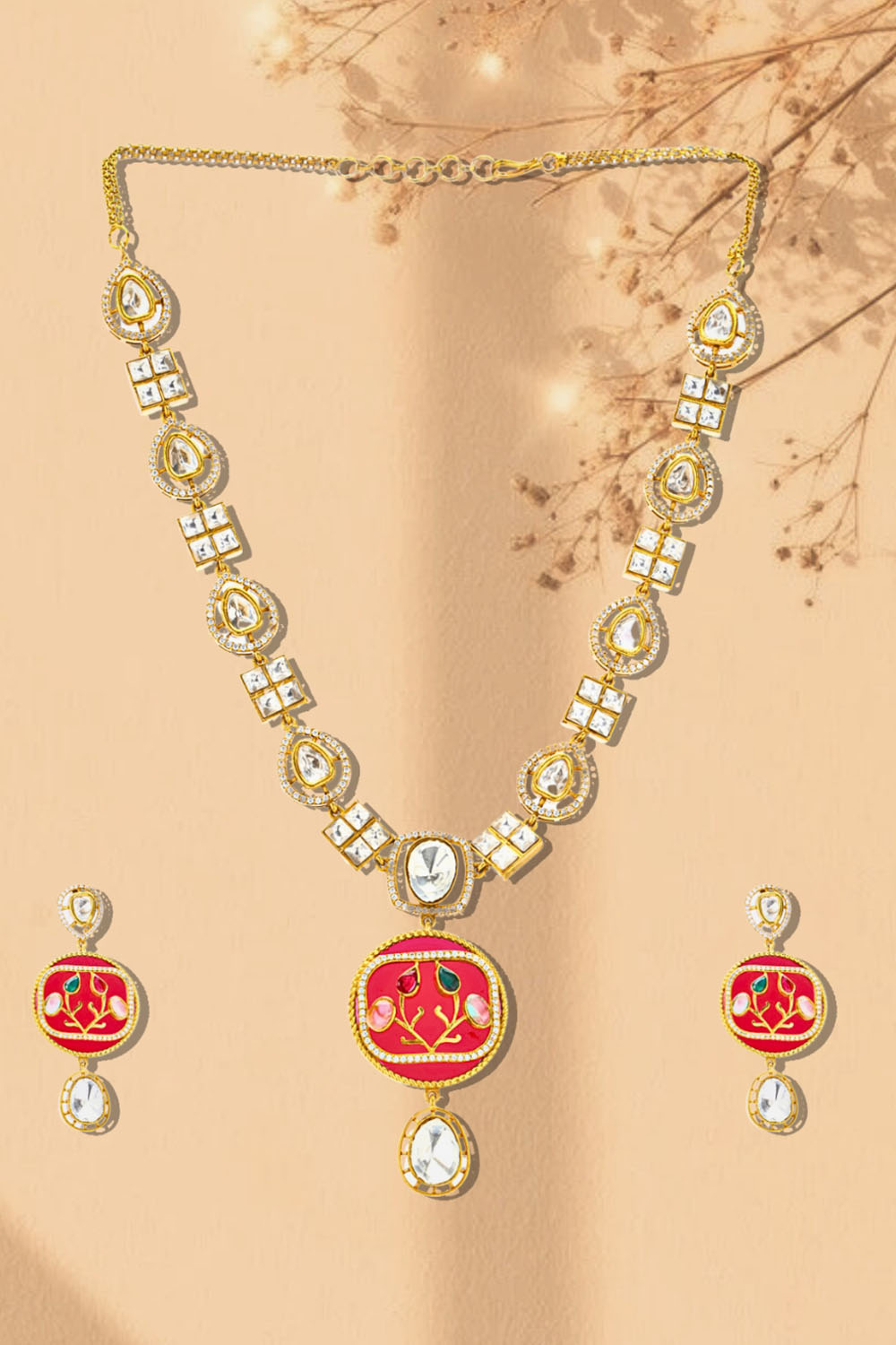 Unveil your inner diva with our Necklace & earring Set a masterpiece that combines artistry and sophistication. Made from Brass this jewelry is adorned with Moissanite, American Diamond, Pearls, Natural Stones ensuring a dazzling finish. Whether you're dressing up for Partywear or adding flair to casual wear, this piece is your ultimate style companion. Pair it with modern accessories to complete your outfit and make every moment sparkle
