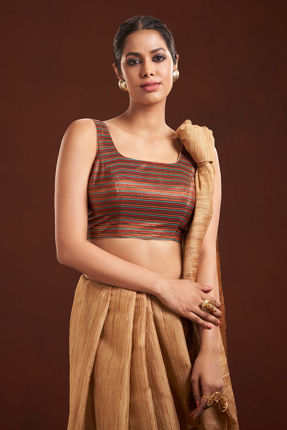 If you're planning to switch your traditional festive saris with an laidback pairings, this multicoloured brocade blouse is a style-savvy piece. The stripes on the sleeveless blouse can complement your ikat saris. Alternatively, you can pair it with an ivory lehenga and temple jewellery for a South Indian inspired appeal.