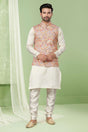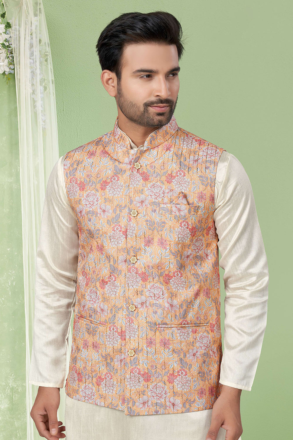 Experience timeless style with our Kurta Pajama Koti Set a perfect balance of tradition and modern sophistication. Made from Mastani Silk this kurta set offers unmatched comfort and a refined look. Featuring Floral Printed it reflects a rich heritage with a modern touch. Designed for Wedding,Engagement this outfit is perfect for special occasion or your celebrations. Complete the look with mojari shoes and a classic watch for a dapper appearance. Make every occasion special with the elegance of Kurta Pajama Koti Set