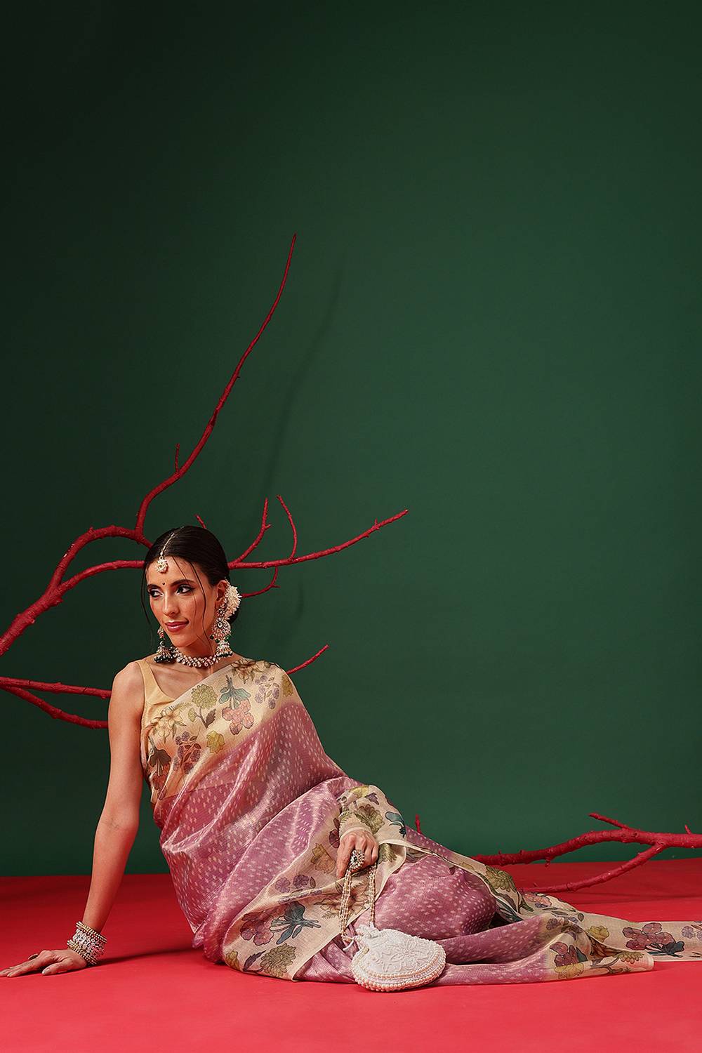 Elevate your wardrobe with our exquisite Saree a masterpiece crafted to add timeless elegance to your style. Made from Tissue this saree offers a perfect mix of comfort and sophistication. Adorned with Floral Printed it showcases intricate craftsmanship that speaks volumes of tradition and artistry. Perfect for Festive this saree is a versatile addition to your collection, ensuring you stand out effortlessly. Pair it with elegant Jewelry, for a glamorous look. Add Clutches or Potli Bags and complete the ensemble with Wedges & Heels , making it a perfect choice for any event. Make a statement and embrace the elegance of Saree today