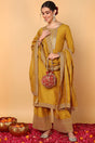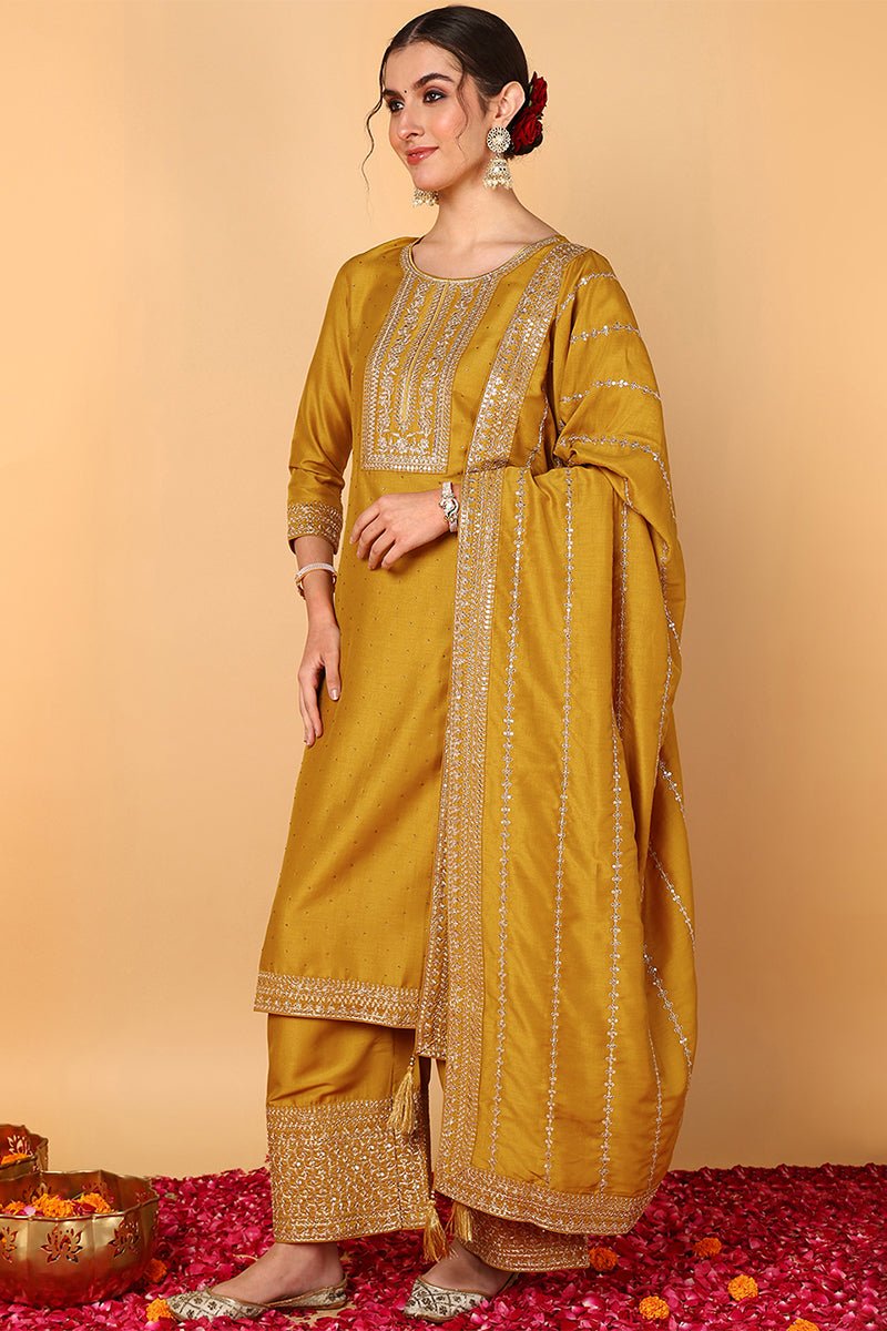 Mustard Silk Blend Solid Embroidered Straight Suit Set