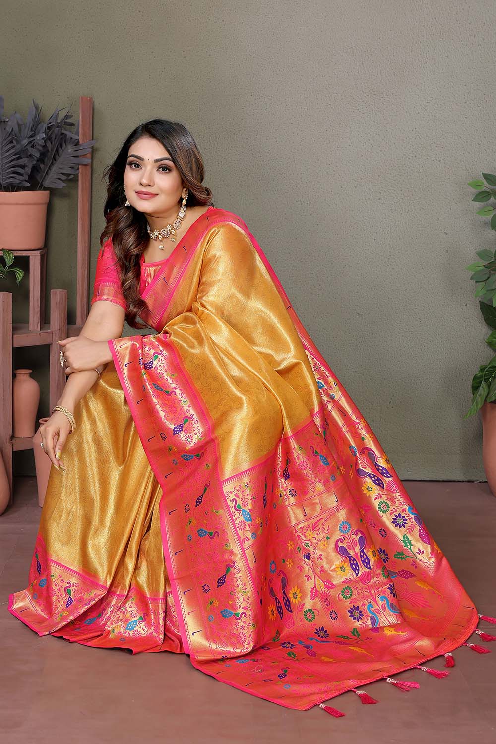 Elevate your wardrobe with our exquisite Saree, a masterpiece crafted to add timeless elegance to your style. Made from Tissue this saree offers a perfect mix of comfort and sophistication. Adorned with Woven it showcases intricate craftsmanship that speaks volumes of tradition and artistry. Perfect for Weddingwear,Haldi this saree is a versatile addition to your collection, ensuring you stand out effortlessly. Pair it with elegant Jewelry, for a glamorous look. Add Clutches or Potli Bags and complete the ensemble with Wedges & Heels , making it a perfect choice for any event. Make a statement and embrace the elegance of Saree today