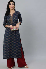 Navy Blue Ethnic Cotton Floral Printed Straight Kurti