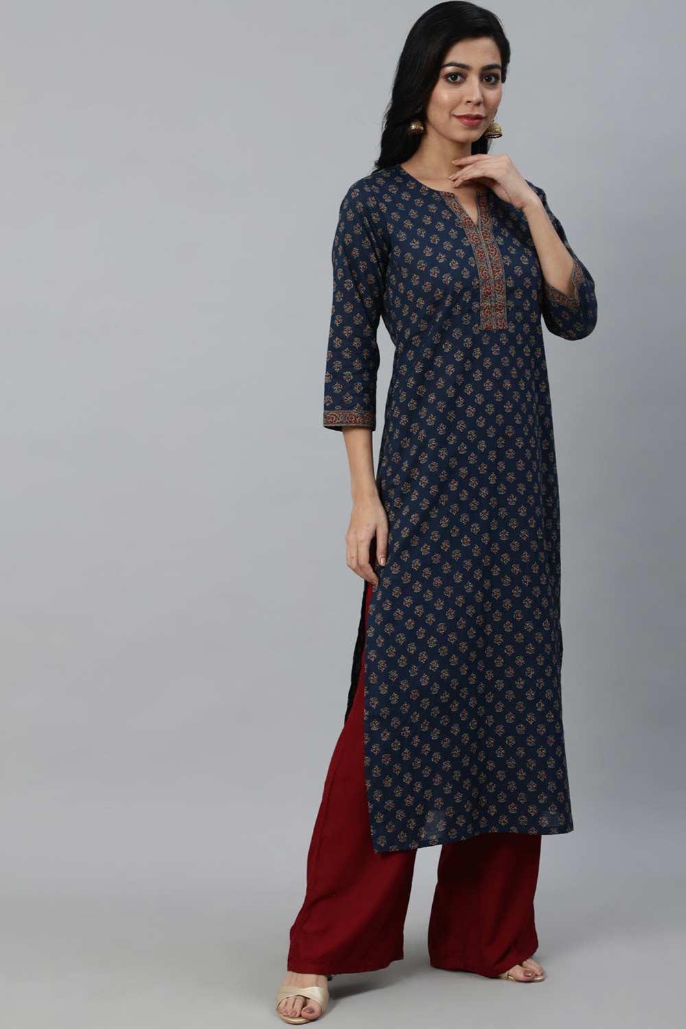 Navy Blue Ethnic Cotton Floral Printed Straight Kurti