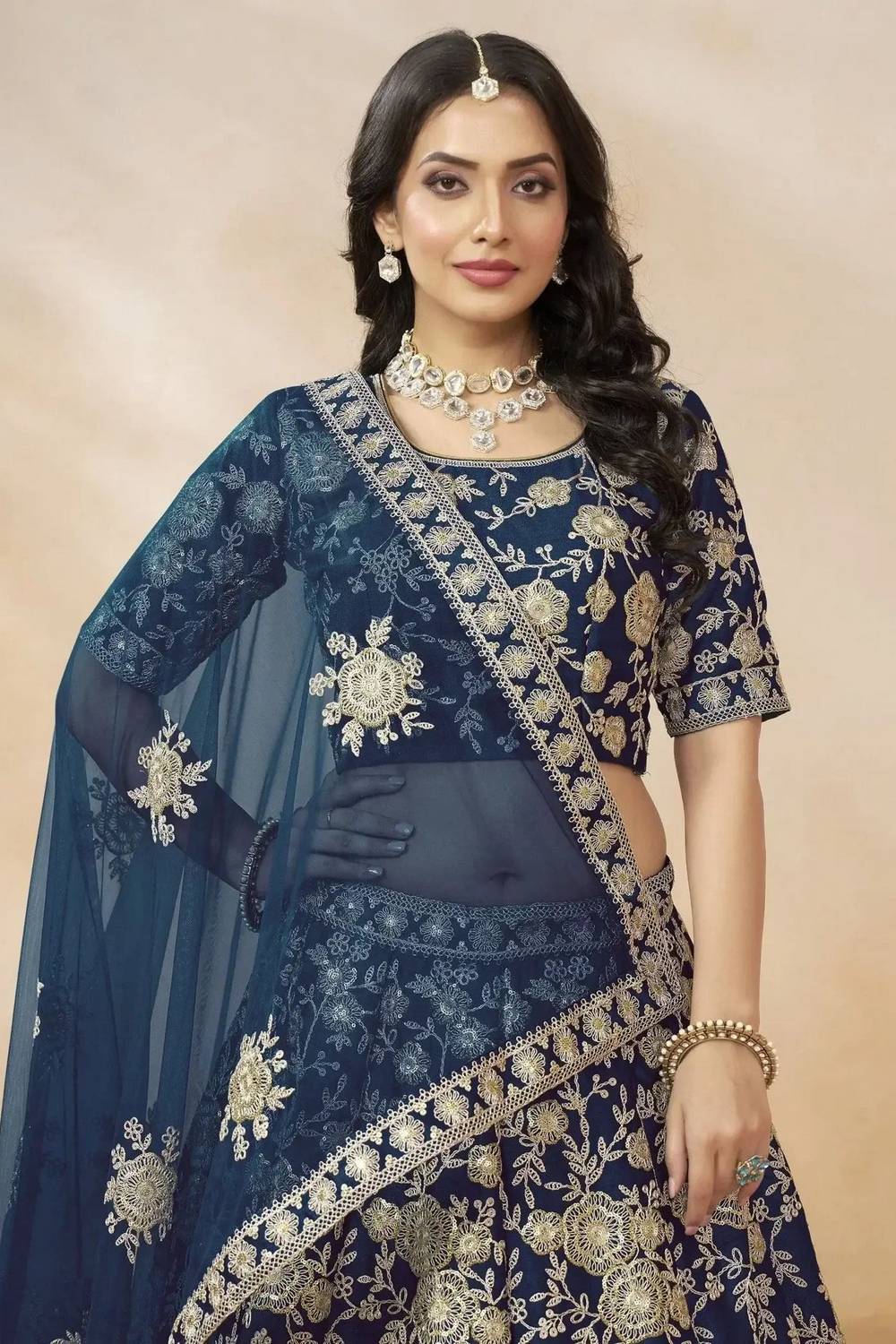 Navy Blue Floral Embroidered Silk Lehenga