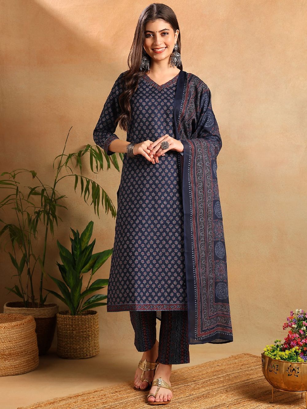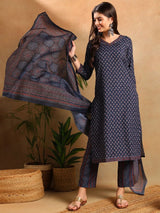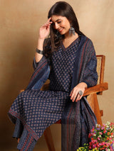 Navy Blue Poly Rayon Ajrakh Printed Straight Kurti Pants With Dupatta