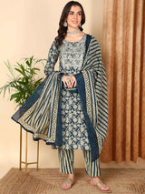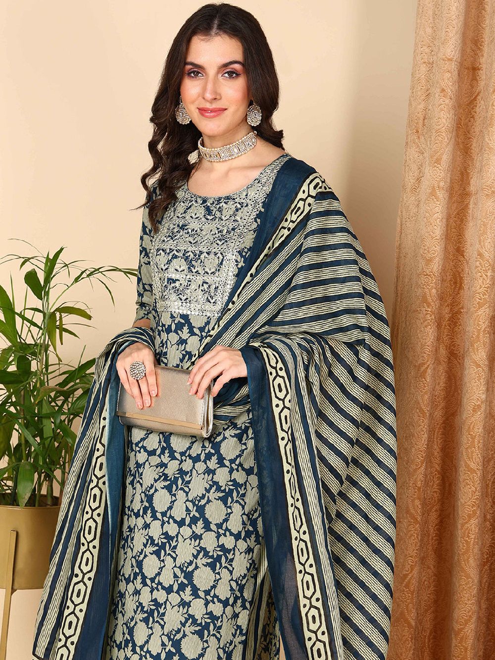 Navy Blue Rayon Blend Floral Embroidered Straight Kurti Pants With Dupatta