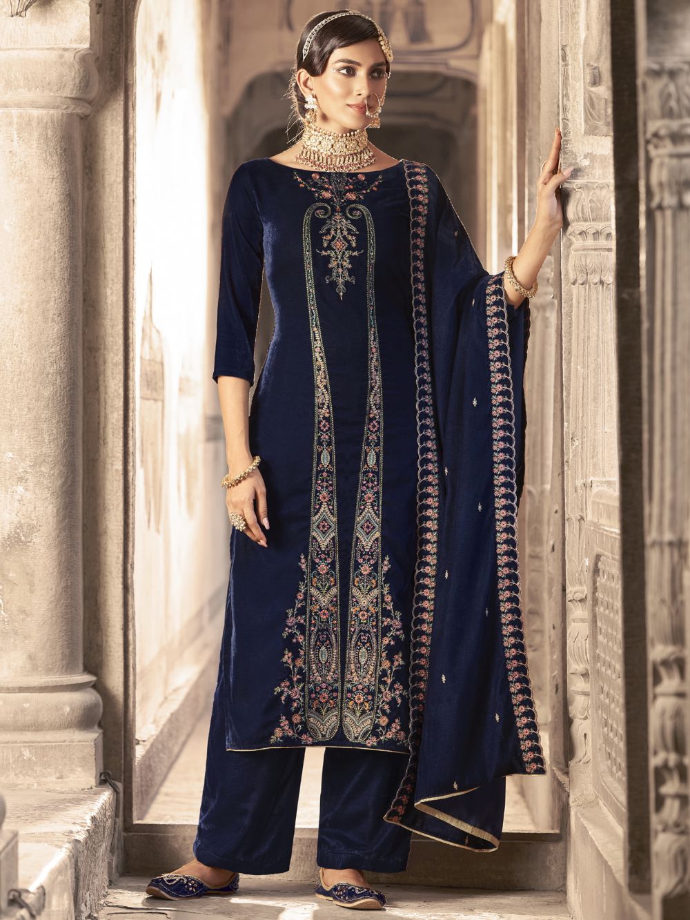 Navy Blue Velvet Embroidered Straight Cut Suits
