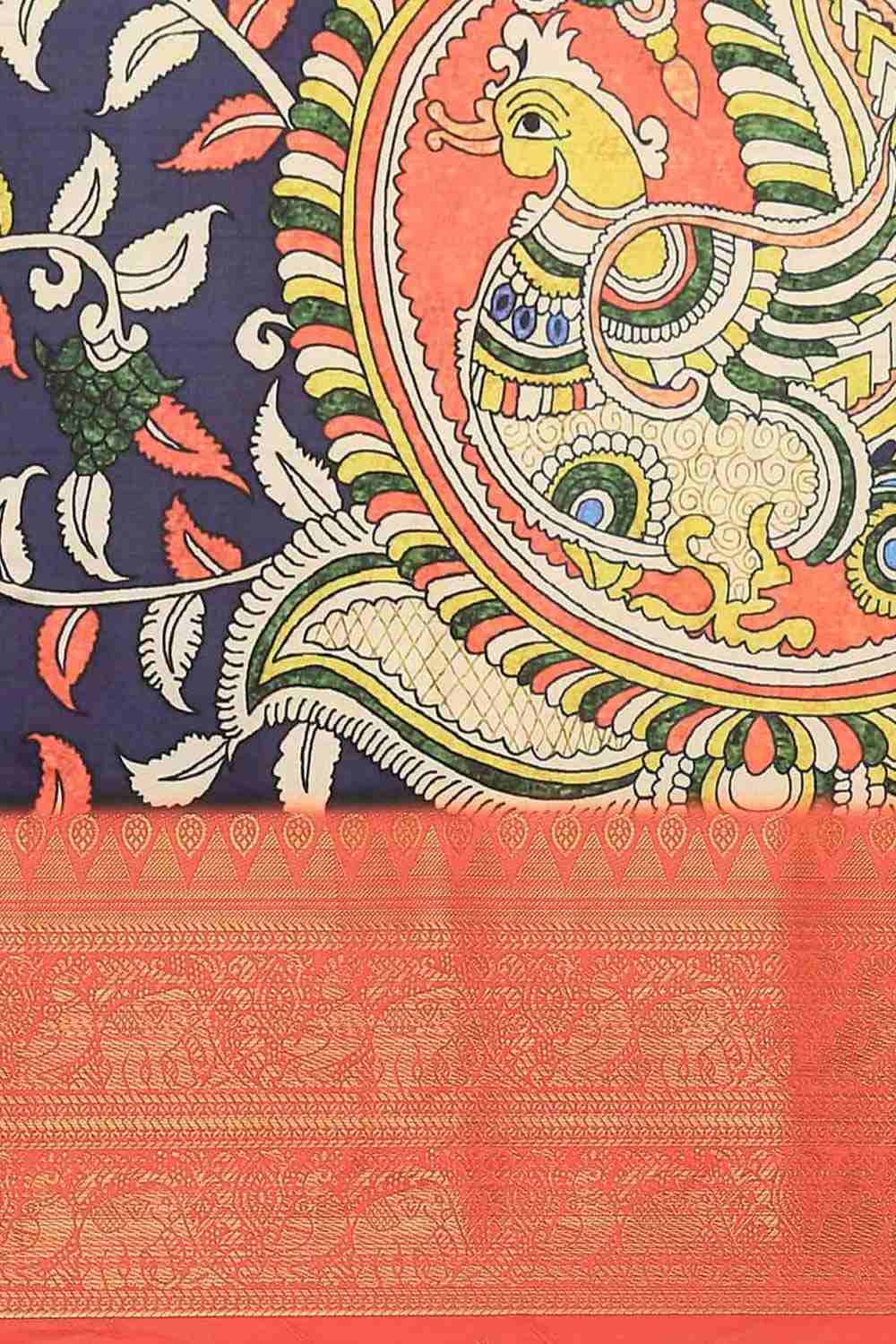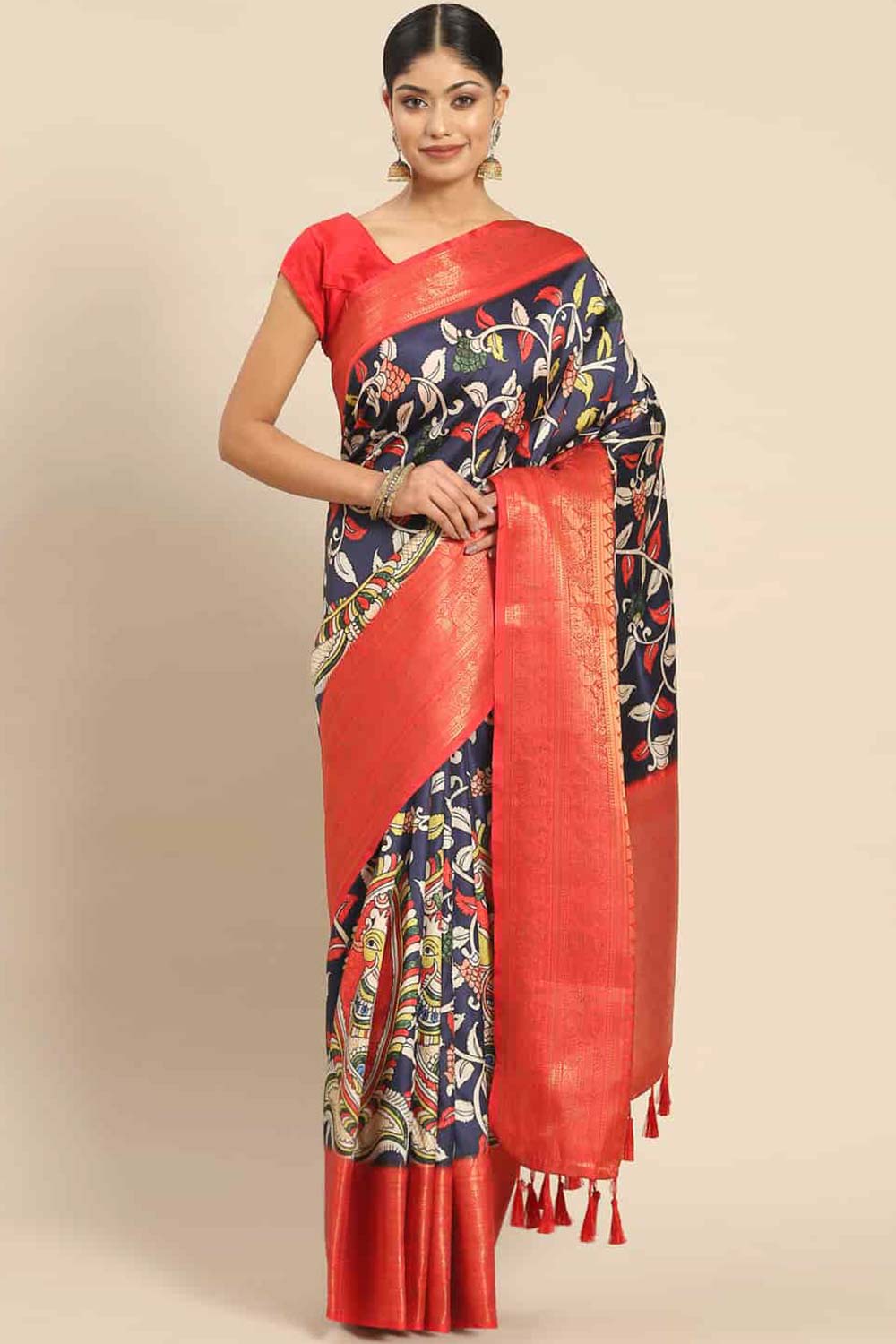 This saree has designed by our designer, it's embellished with the zari all over a saree. It's made with regal weave fabrics along with digital print and woven designs combination for it's beautiful and elegant look. You can wear this saree in party with minimal jewellery and you are ready to GO..!! Saree has a also different type of abstract, kalamkari and floral design, also saree has a contrast border too.