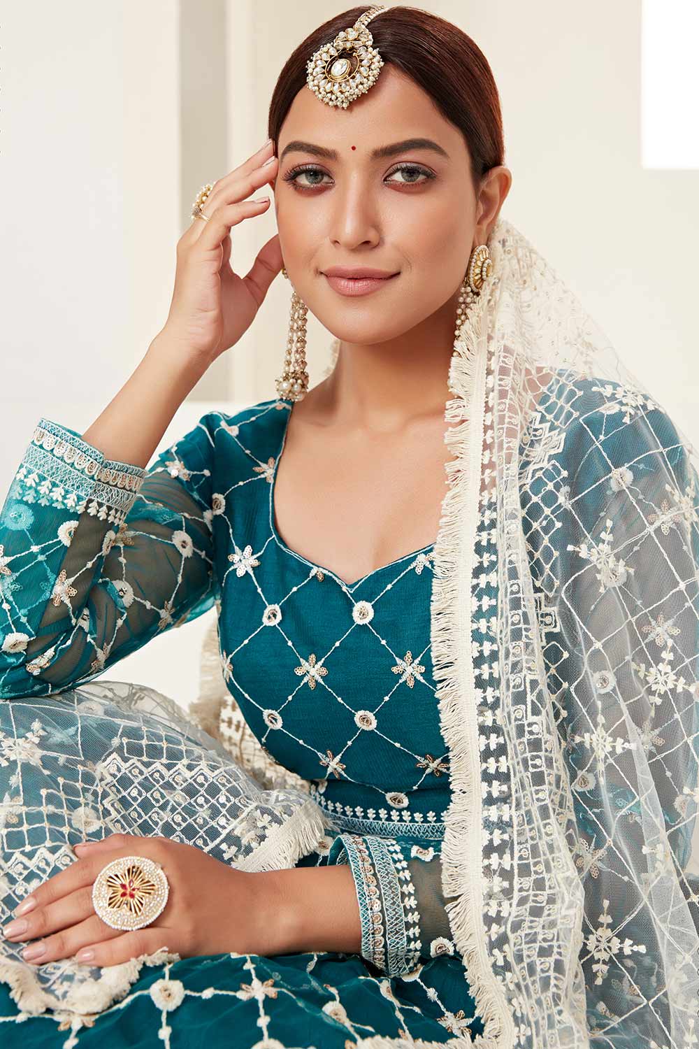Net Embroidered Lehenga Choli Dress Material In Teal Green