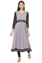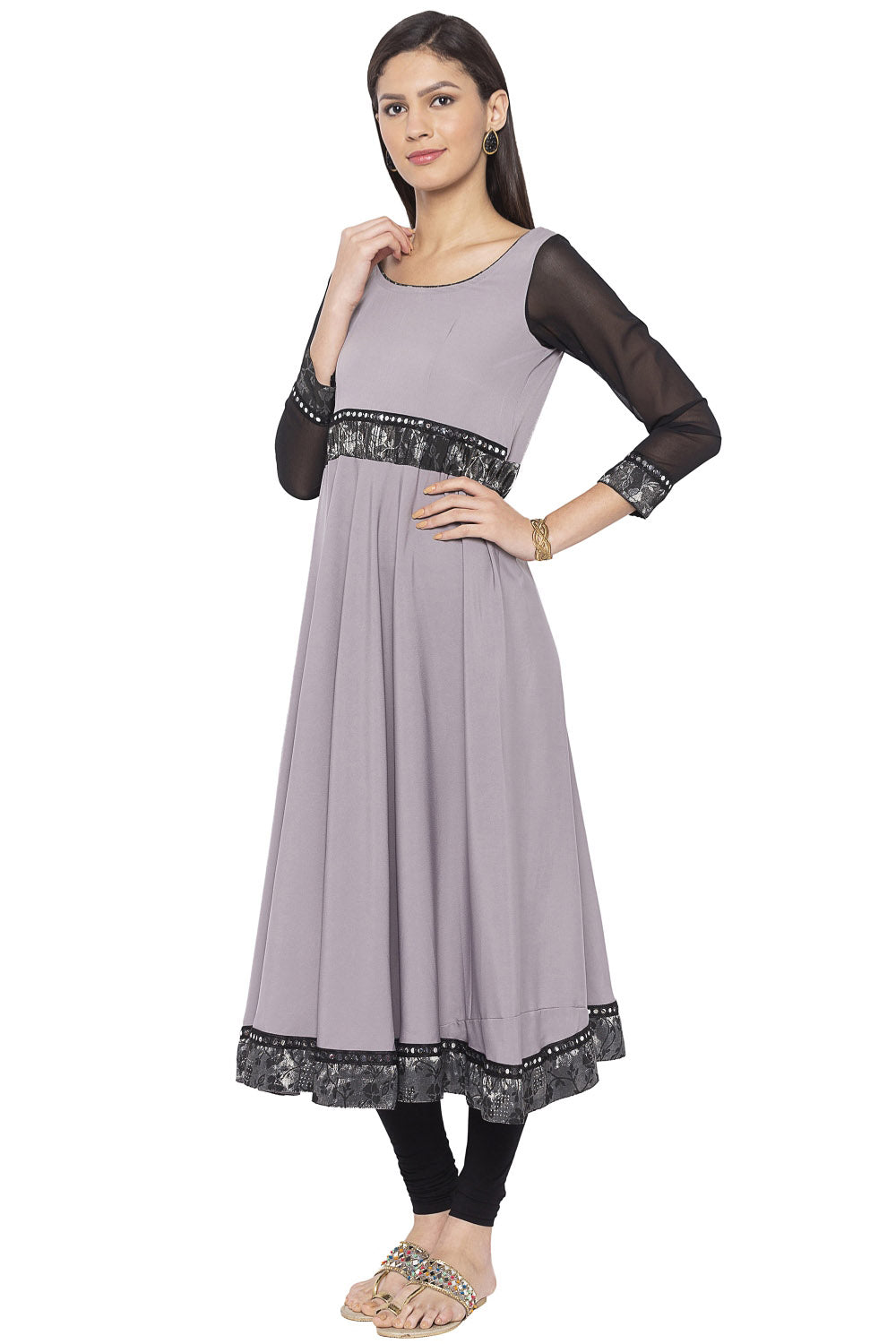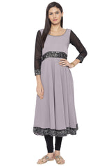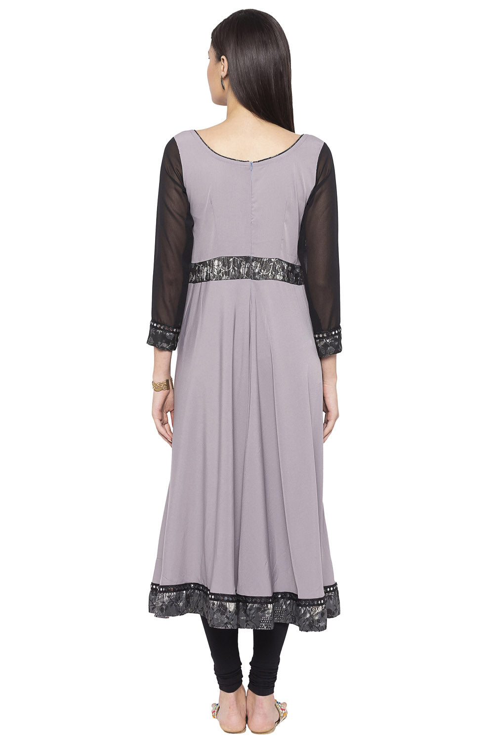 Grey American crepe flared Kurti with black georgette full sleeves black shimmer fabric with mirror embroidery on waistline sleeves and hemline