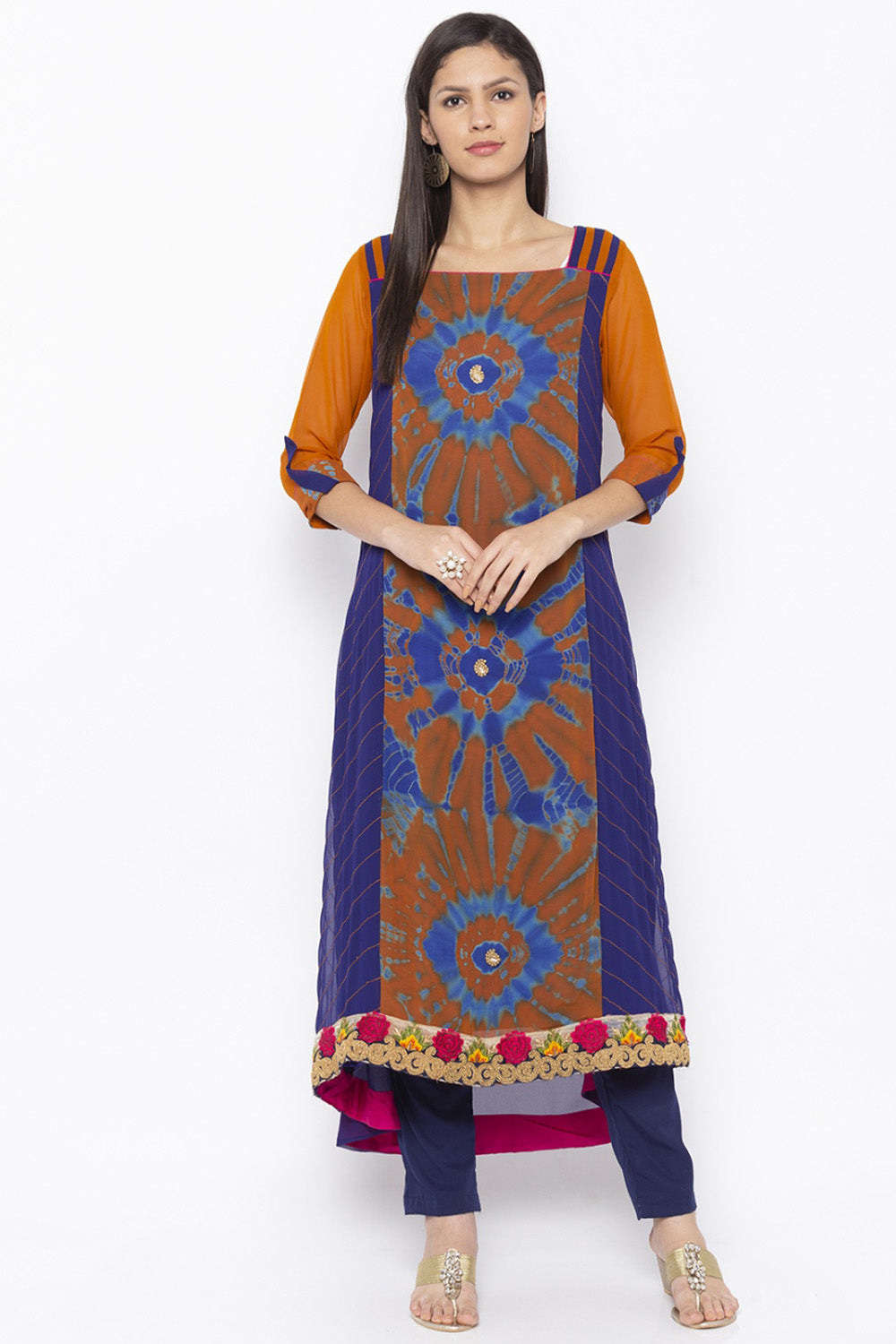Midnight blue mustard tie-dye batik kalidar Kurti asymmetrical with contrast double stitching on side panels contrast detailing on shoulders and on three quarter sleeves with embroidery on asymmetrical hemline.