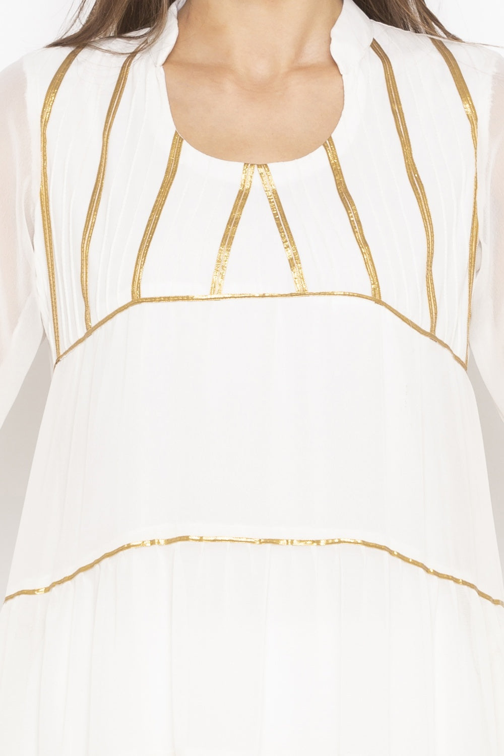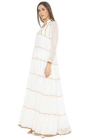 White floor length georgette multi tiered Kurti with pintucks and gold gota detailing on yoke. Panels and full sleeves