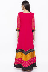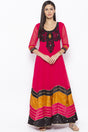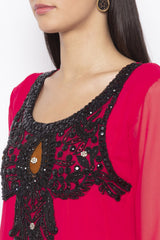 Coral pink full length kalidar Kurti with heavy black crystal embroidery on yoke three color triangular fabric detailing in ghera with silver crystal embroidery over it three quarters sleeves.