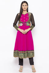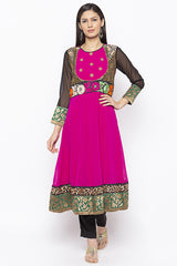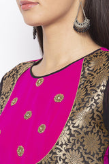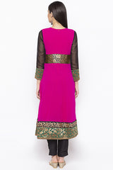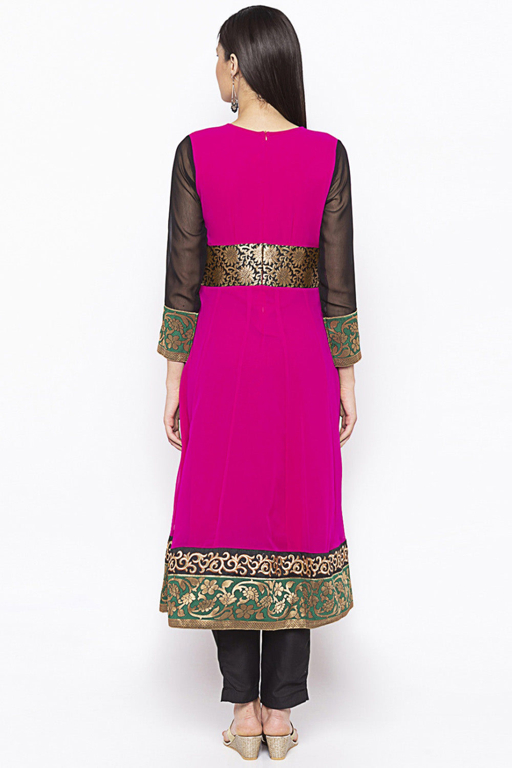 Pink kalidar Kurti with black brocade half body embroidered border on waistline and motifs on upper body. Benaras brocade and embroidery border on hemline and three quarter black sheer sleeves worn with black cigarette pants and black gold crush dupatta