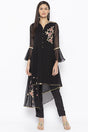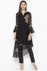 Black asymmetrical georgette Kurti with pin tucks detailing on one side and embroidered detailing on the other with gold embroidery border on collar shoulders and inner Kurti hemline and asymmetrical bell sleeves embellished with gold diamond buttons