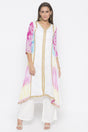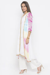 White multi-blue pink lehariya tie-dye shaded kalidar asymmetrical Kurti with gold and white pearl embroidery in the front panel and blue and pink color stitching detailing in front with gold embroidered border on kalis worn.