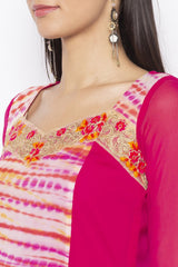 Pink white ombre leheriya georgette shaded batik asymmetrical kalidar Kurti with embroidered border and motifs all over in the front.